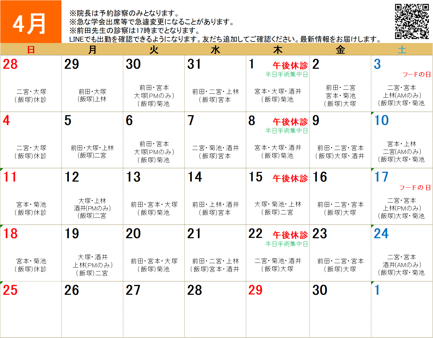 4月獣医師出勤表