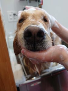 2度目のシャンプーでは、抗菌の薬用シャンプーを付け置きすることで、全身に浸透させていきます。