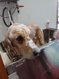 この後はスーパーヒアルロン酸配合の保湿剤の全身かけ流しをおこない、皮膚被毛へ保湿成分の浸透を待ちます。