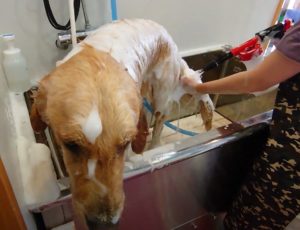 別館の待合室からトリミング室を覗くと、大きな患者さんがシャンプーされているではありませんか(; ・`д・´)